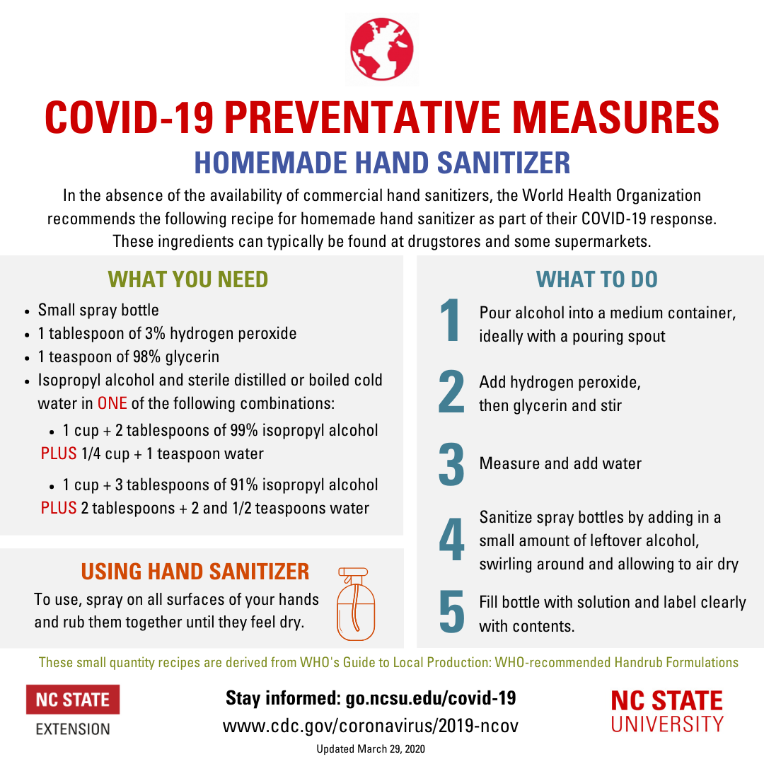- Homemade Hand Sanitizer (3.30.20) - Small scale recipe from World Health Organization formulation